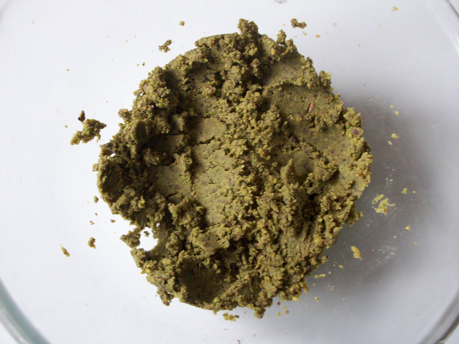 Ho impastato il pistacchio con zucchero ed amido, ho unito l'uovo ed infine il latte bollente a filo, mescolando continuamente.